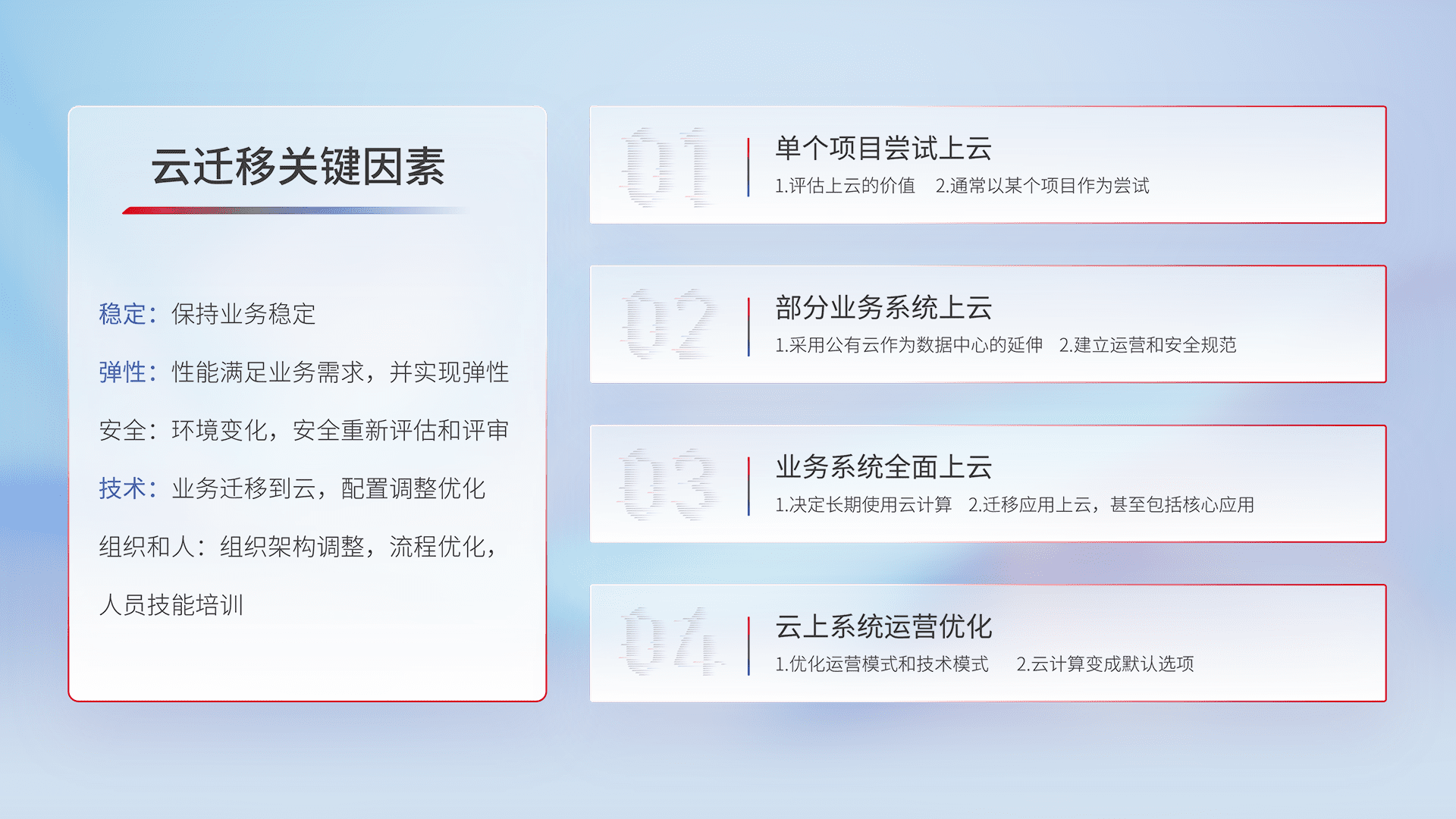 结合实际业务,,,,从规划设计、、、云平台选型、、云原生改造、、、、数据迁移、、、、集成交付,,,,迁移全过程为客户识别最佳上云路径,,,做好风险识别管理,,设计网络架构、、、身份权限、、、、安全审计合规、、、、操作审计、、、日志审计、、、、监控告警策略、、、、多站点容灾设计等,,对云上基础设施进行整体规划,,提升IT治理水平,,以满足弹性、、、、高可用、、、、高性能的需求。。。。